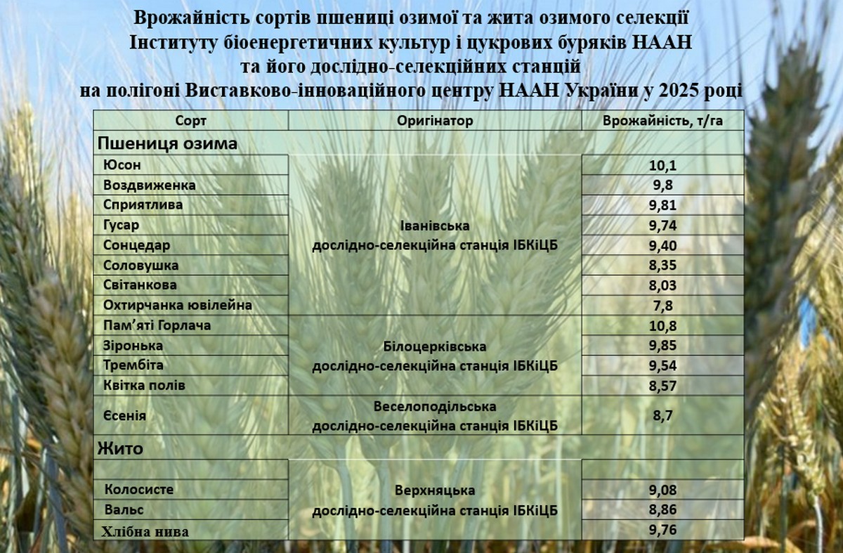 Так, у 2025 році на полігоні Виставково-інноваційного центру НААН України (ДПДГ «Саливонківське» ІБКіЦБ) вивчалися сорти озимих культур селекції НААН України різного еколого-географічного походження (посів 26-27 вересня 2024 року). За даними результатів обліку врожайності, проведеного ННЦ «Інститут землеробства НААН», встановлено, що сорти пшениці озимої селекції Інституту біоенергетичних культур і цукрових буряків НААН та його дослідно-селекційних станцій відзначились високою врожайністю.