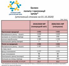Баланс попиту та пропозиції цукру від Економічного дискусійного клубу на 01.10.2020 р.