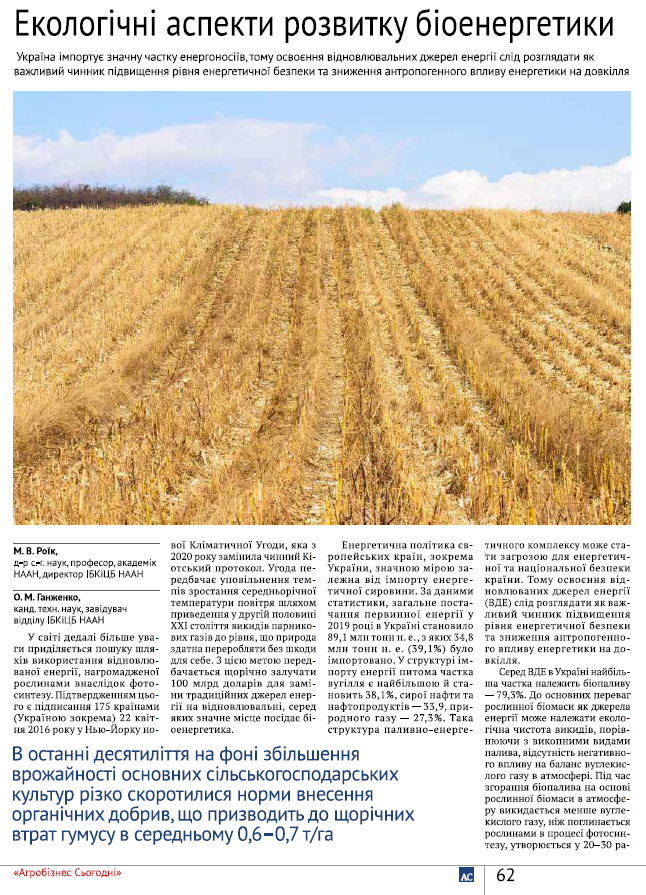 На мультимедійній платформі для аграріїв «Агробізнес сьогодні» у №5 за 2021 рік вийшла стаття «Екологічні аспекти розвитку біоенергетики», в якій автори (М.В. Роїк – д-р с.-г. наук, професор, академік НААН, директор ІБКіЦБ НААН; О.М. Ганженко – канд. техн. наук, зав. відділу селекції і сталих технологій вирощування та переробляння біоенергетичних культур ІБКіЦБ) відмічають, що використання пожнивних решток аграрного виробництва в якості сировини для біопалива не відповідає критеріям сталого розвитку та порушує українське законодавство щодо раціонального використання земель. Натомість закладка плантацій багаторічних біоенергетичних рослин на малопродуктивних та схильних до ерозії землях сприятиме відновленню їх родючості та забезпечить стале надходження високоякісної сировини для виробництва різних видів біопалива.