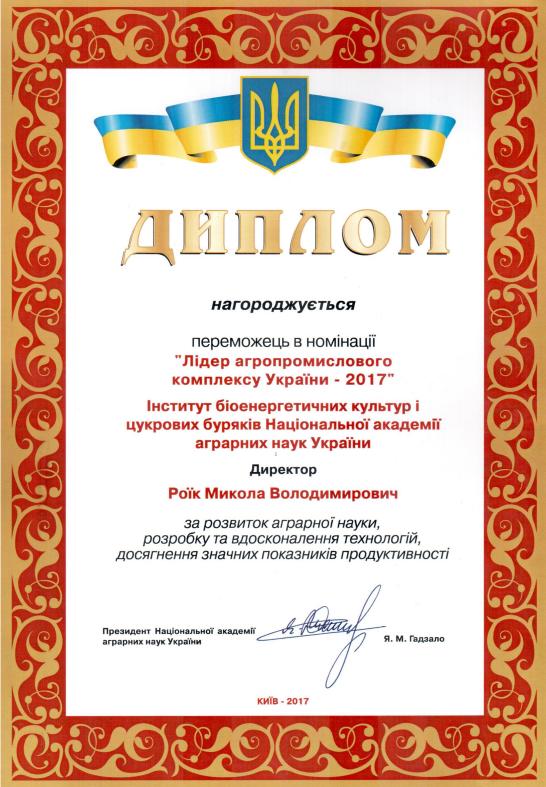 За розвиток аграрної науки, розробку та вдосконалення технологій, досягнення значних показників продуктивності Інститут біоенергетичних культур і цукрових буряків нагороджений дипломом Президії НААН України в номінації «Лідер агропромислового комплексу України 2017».