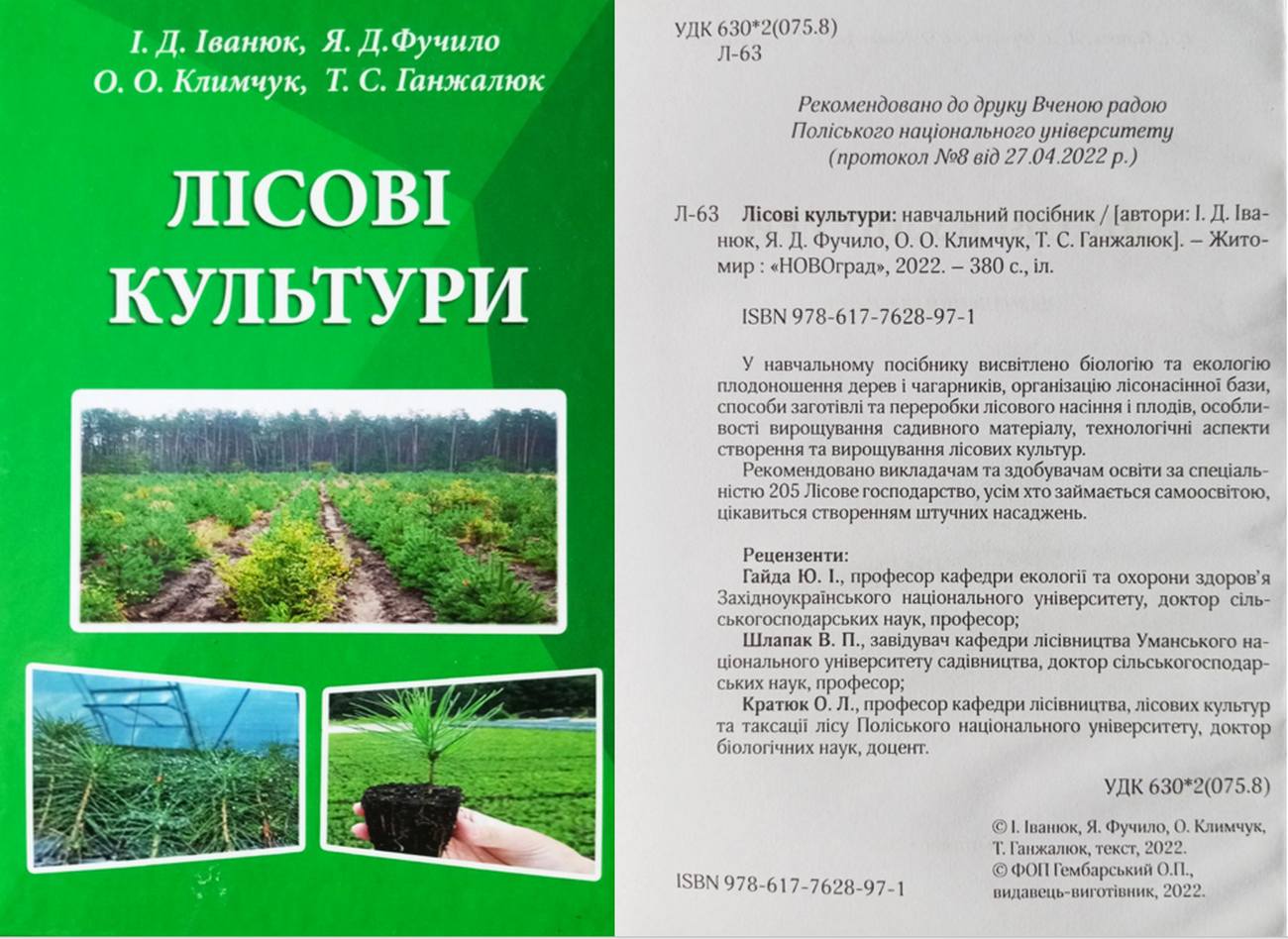 Іванюк І.Д., Фучило Я. Д., Климчук О. О., Ганжалюк Т. С. Лісові культури: навчальний посібник. Житомир: НОВОград, 2022. 381 с. ISBN 978-617-7628-97-1