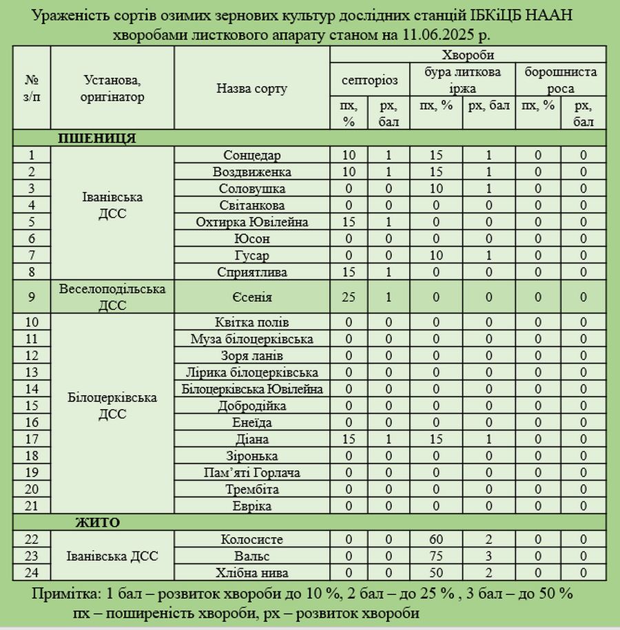 За обстеження встановлено, що частина сортів пшениці озимої, озимого жита, тритикале і озимого ячменю були уражені у різному ступені такими хворобами листкового апарату як септоріоз, бура листкова іржа і борошниста роса. Так, на відміну від попередніх років, у поточному році значна частина сортів цих культур були уражені у різному ступені бурою листковою іржею, і лише деякі з них септоріозом та борошнистою росою. Зокрема, із обстежених 134 ділянок посівів озимих зернових культур бурою листковою іржою було уражено 74 сорти, або 55,0 %, у тому числі 49 сортів пшениці озимої (49 %), 12 сортів озимого ячменю (100 %), 13 сортів тритикале (61 %), 3 сорти жита (50 %).