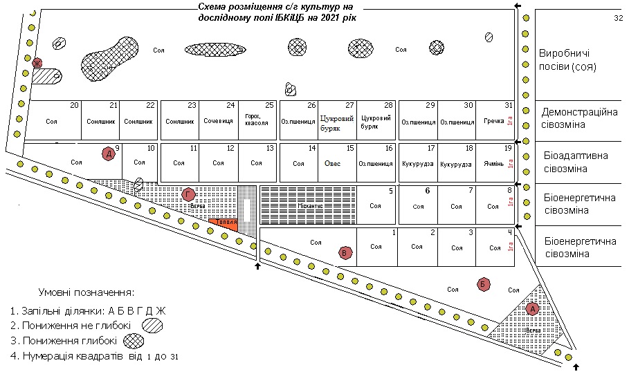 Схема розміщення посівів сільськогосподарських культур на дослідному полі в 2021 році