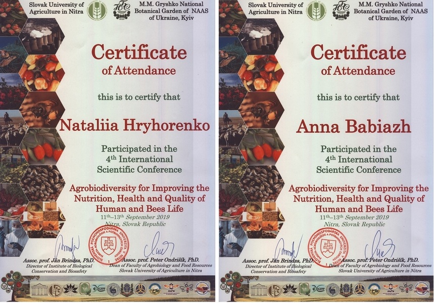 Григоренко Н.О., Бабяж А.І.: участь у міжнародній конференції 4th International Scientific Conference. Agrobiodiversity for Improve the Nutrition, Health and Quality of Human and Bees Life, (Nitra, Slovakia September 11-13, 2019)